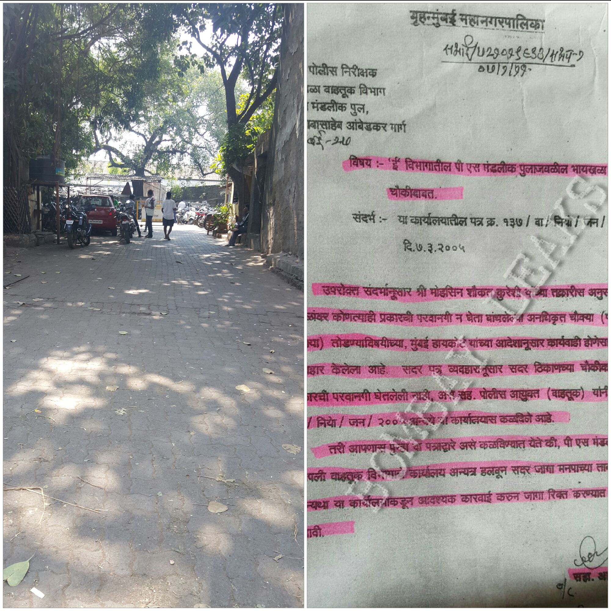 बाऐं तरफ मुबंई ट्राफिक पुलिस के जरिए गैर कानूनी तरीके से कब्जा की हुई जगह एस ब्रिज और दाऐं तरफ बीएमसी की ओर से जारी की गई नोटिस की कापीशाहिद अंसारी
