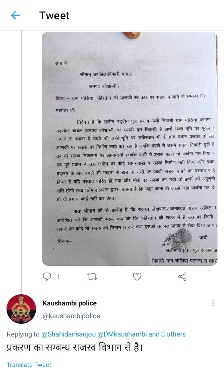 इस मामले में कौशांबी पुलिस ने ट्वीट पर सफाई देते हुए कहा की यह राजस्व विभाग का मामला है।